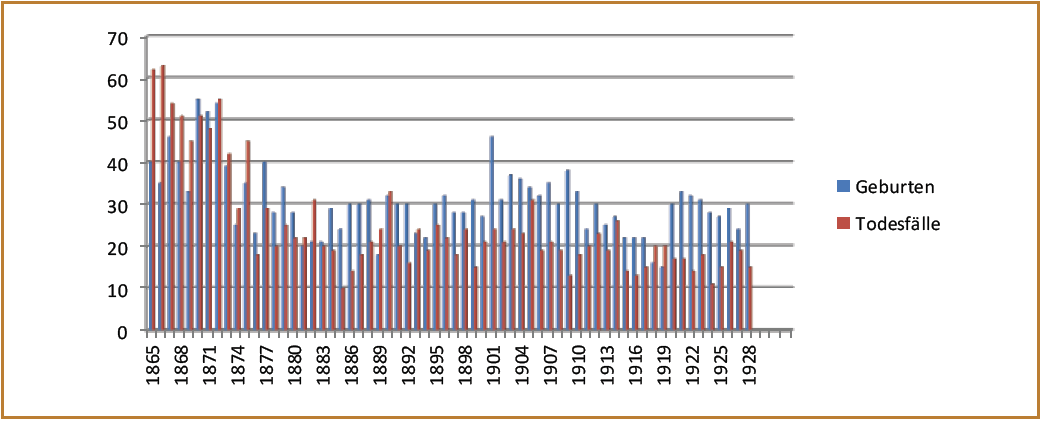 Anzahl Geburten und Todesfälle in Eiken zwischen 1865 und 1928. (Quelle: Sterbebücher Regionales Zivilstandsamt Laufenburg)